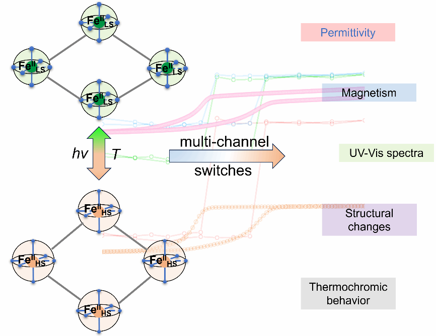 自旋交叉分子材料的多功能化是分子磁性领域的研究热点,其磁性与介电、荧光、铁电等性质的耦合与调控为多功能材料的设计与合成提供了思路。Hofmann型金属有机框架结构作为载体,具有自旋交叉与介电功能的耦合与调控优势。近日,本课题组成功利用K2[M(CN)4]、(3,4-二-4-吡啶基)噻吩与FeII离子进行自组装,获得了两例具有滞回型磁-介电双稳态行为的配合物{Fe(3,4-bpt)2[M(CN)4]} (M= Pt, Pd),并实现了对其磁性双稳态的光可逆调控,使该类配合物在磁、电、结构和热致变色等方面表现出多通道转换行为,为开发具有滞回型磁-介电双稳态行为的多功能材料提供了新的思路。该文章最近发表在Inorganic Chemistry Frontiers. 2024, DOI: 10.1039/D3QI02660D.
